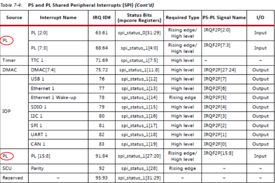 PL到PS部分的中断经过ICD控制器分发器后同时进入CPU1 和CPU0。从下面的表格中可以看到中断向量的具体值。PL到PS部分一共有20个中断可以使用。其中4个是快速中断。剩余的16个是本章中涉及了,可以任意定义。如下表所示。