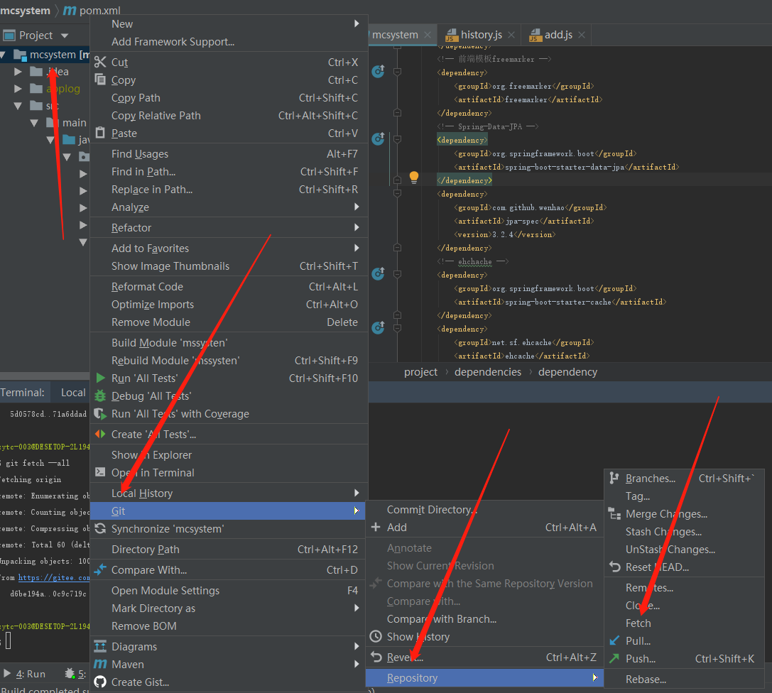 1、在左侧的代码目录中,点击右键,选择 Git ----> Repository -----> fetch