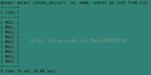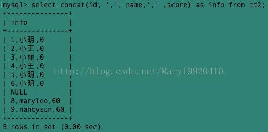 例1:select concat (id, name, score) as info from tt2;
