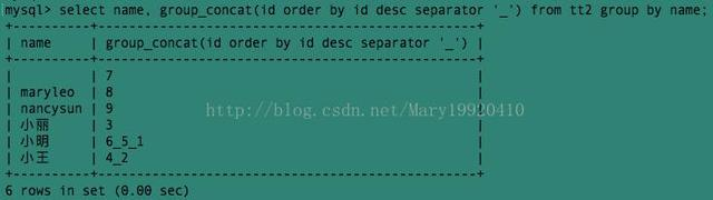 说明:通过使用distinct可以排除重复值;如果希望对结果中的值进行排序,可以使用order by子句;separator是一个字符串值,缺省为一个逗号。