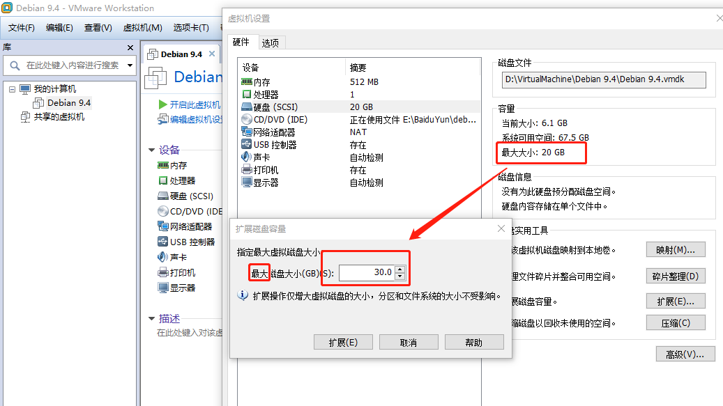注意: VM扩张虚拟机硬盘,虚拟机不能存在快照。