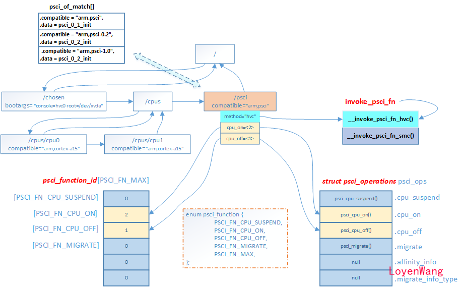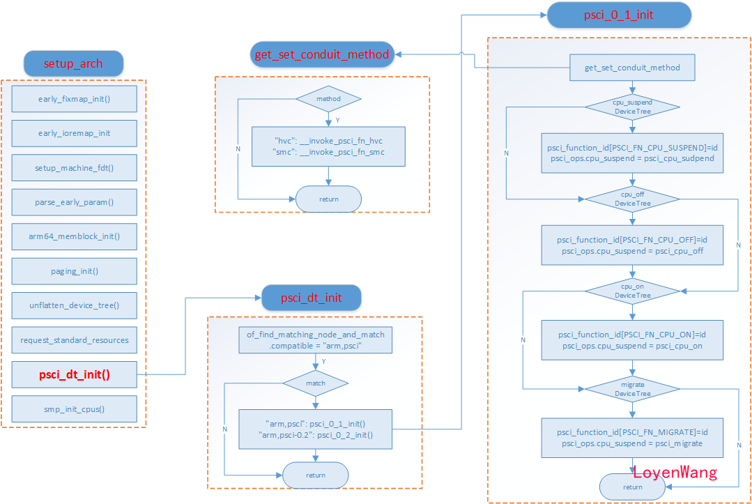 setup_arch开始跟踪,能看到入口为psci_dt_init(),从而跳转到driver/firmware/psci.c中的函数中; psci_dt_init()会去读取并解析Device Tree中的内容,从而选择版本(psci_0_1_init/psci_0_2_init),选择指令(hvc/smc)等;psci_0_1_init()函数完成的主要内容其实是填充对应的函数指针,以及psci_function_id[]数组;