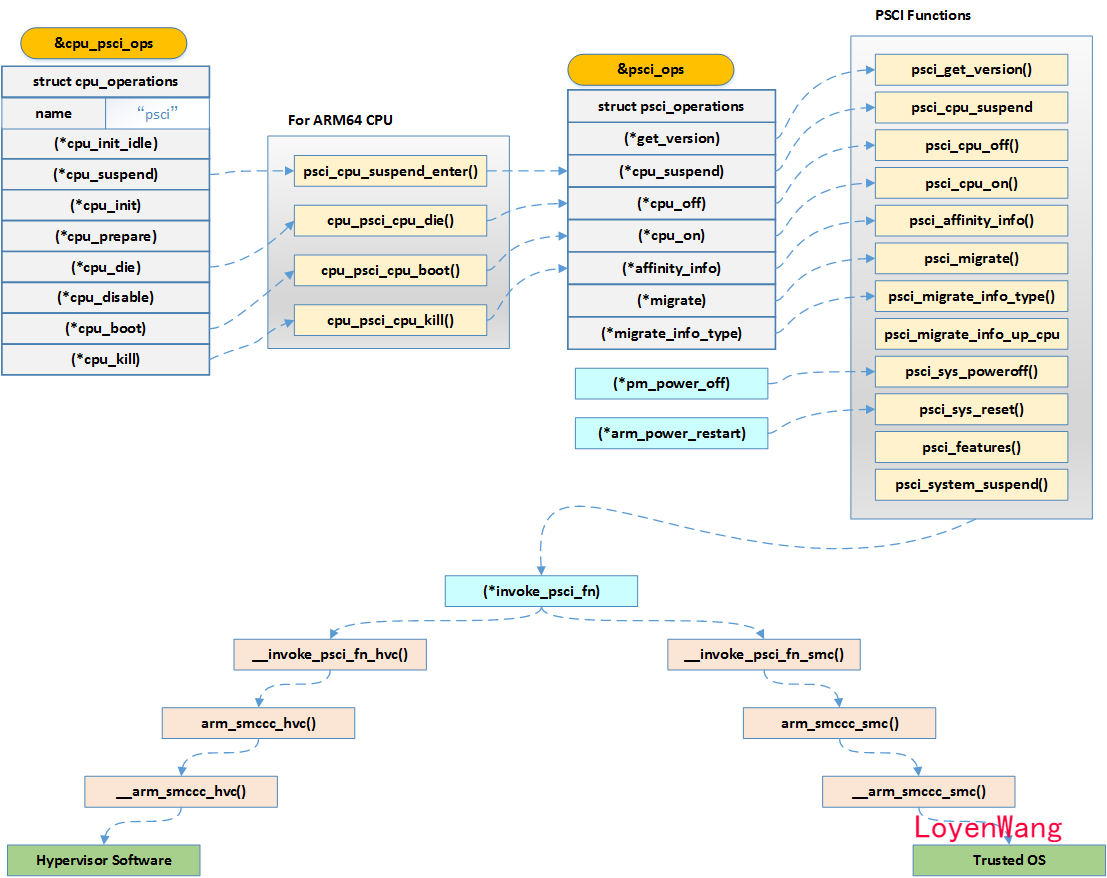 PSCI, Power State Coordination Interface,由ARM定义的电源管理接口规范,通常由Firmware来实现,而Linux系统可以通过smc/hvc指令来进入不同的Exception Level,进而调用对应的实现。
