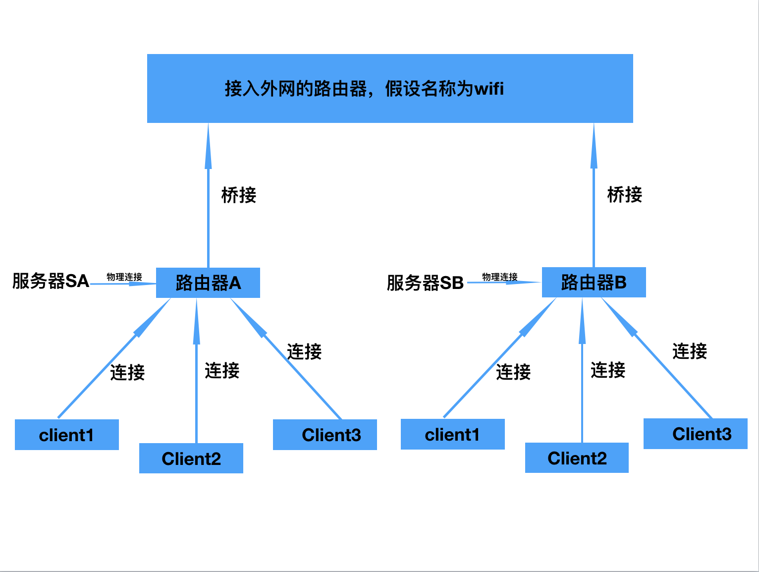A通过网线与SA第四个网口相连,前三个网口桥接在一个网桥br0即可。