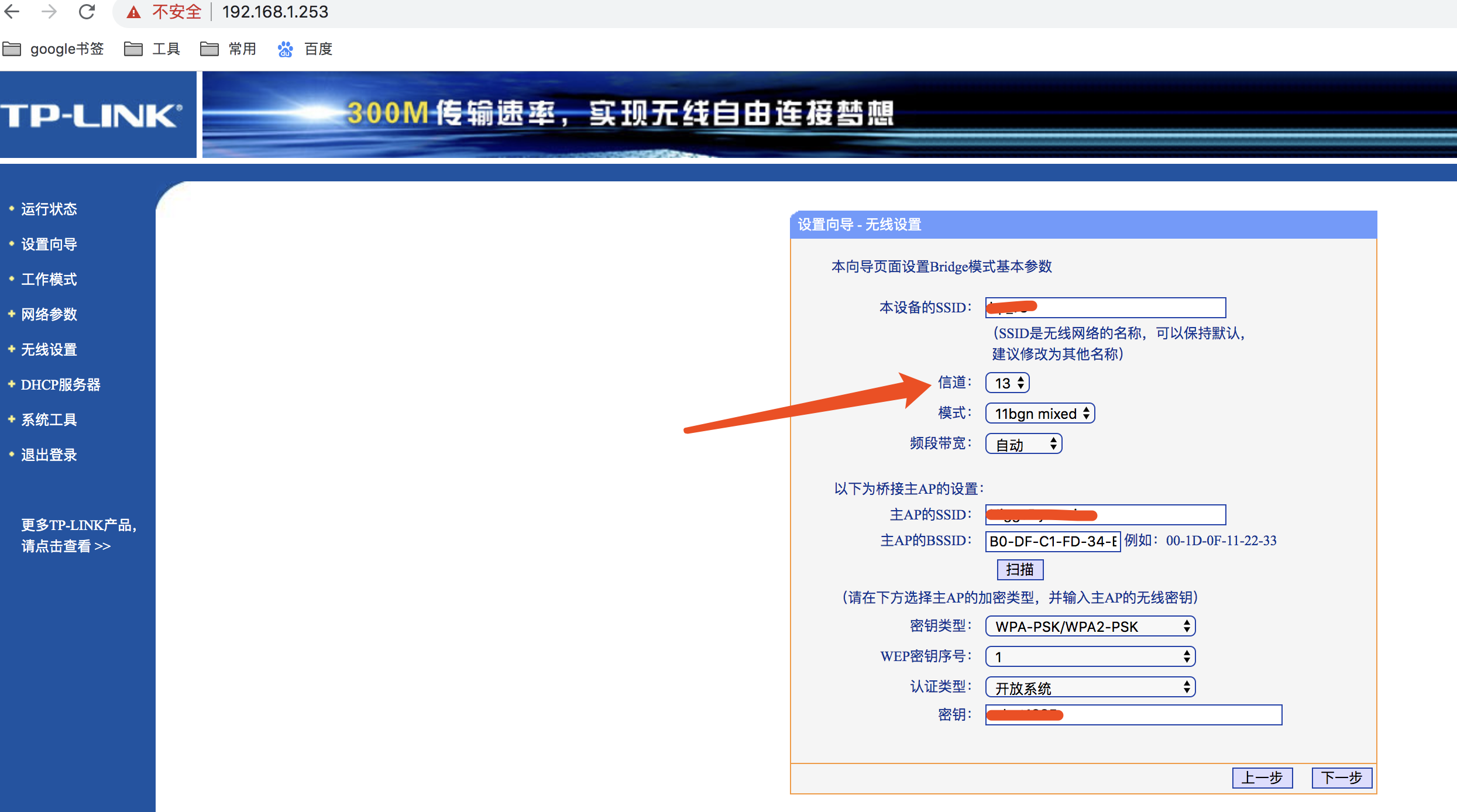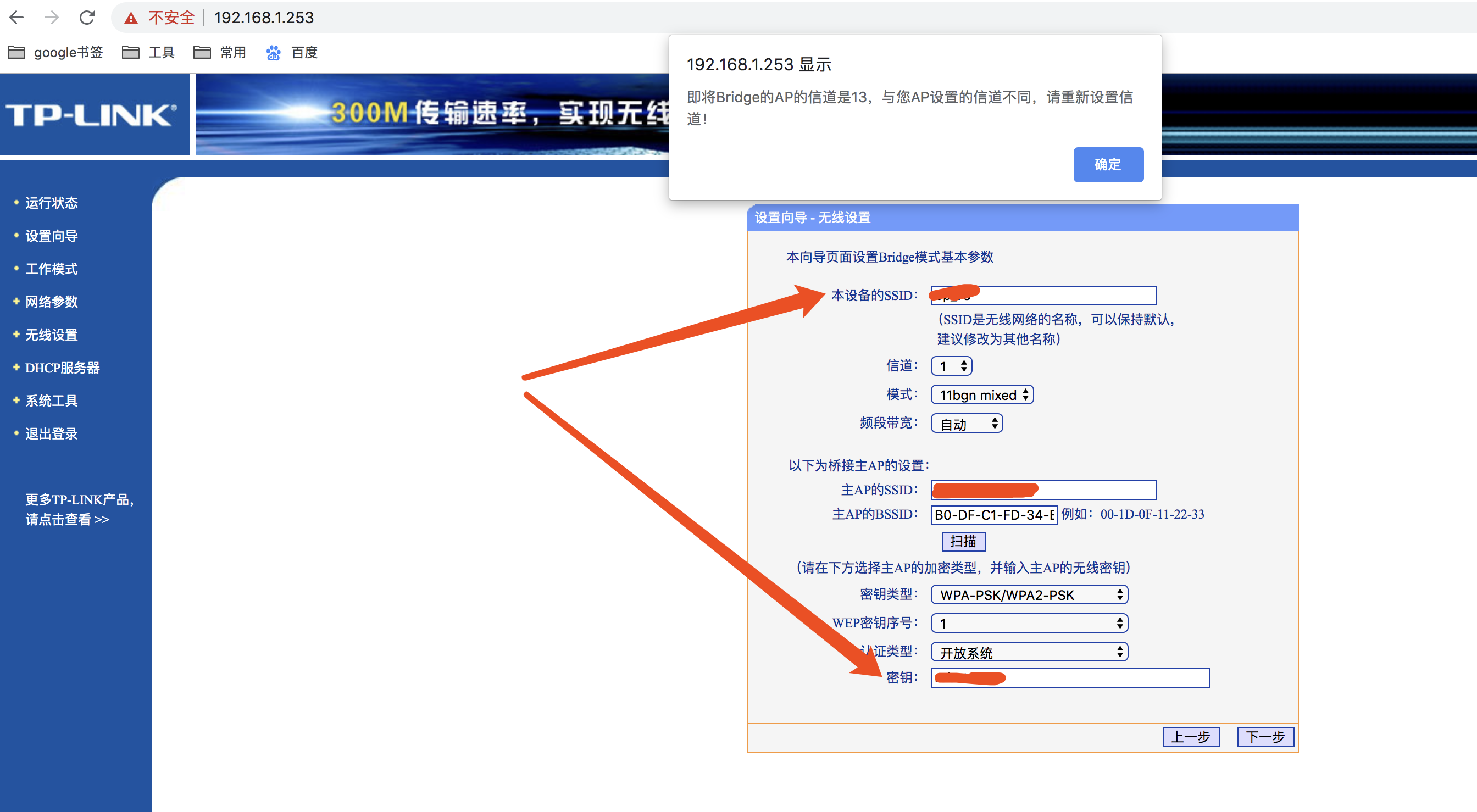 然后设置名称和加密秘匙,点击下一步,你可能会看到提示,这是因为你选择的那个wifi所使用的是13信道,所以你也需要把你的路由器设置为13信道