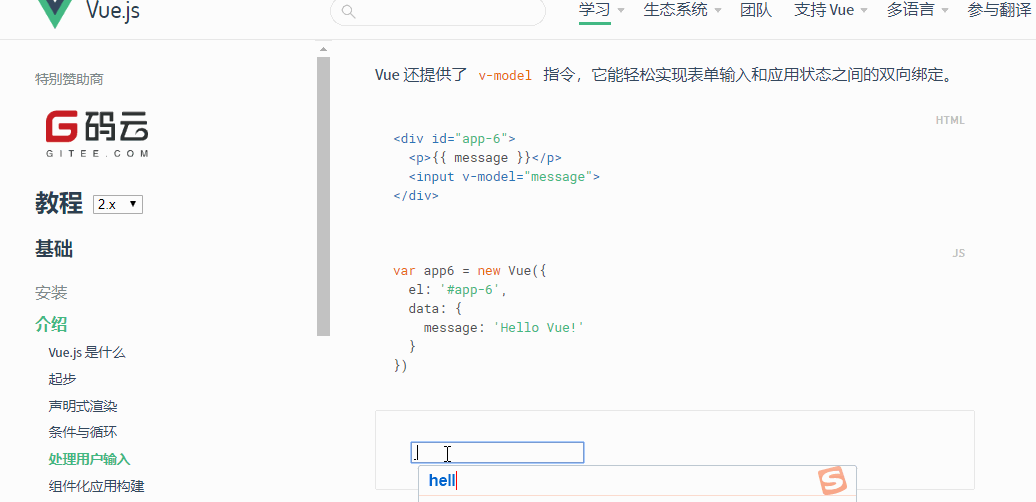 双向数据绑定:简言之 数据动 页面动,页面动,数据动, 典型的应用就是在做表单时候,输入框的内容改动后,跟该输入框的value 的值改动。