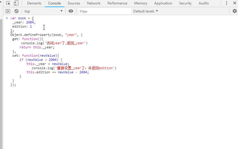 Object.defineProperty() 的具体介绍,我们本文不做具体展开,查看我这里的一篇文章,Object.defineProperty。 我们这里先要知道这么一个事情。这个方法要传入三个参数,传入的数据对象data,属性key,描述符对象。其中,描述符(descriptor)对象的属 性必须是:configurable、enumerable、writable 和 value。设置其中的一或多个值,可以修改 对应的特性值。我们需要用的是这访问器属性。当我们在读取访问器属性时,会调用 getter 函数,这个函数负责返回有效的值;在写入访问器属性时,会调用 setter 函数并传入新值,这个函数负责决定如何处理数据。上文代码上的 get 方法,在读取属性时调用的函数,set方法,在写入属性时调用的函数。