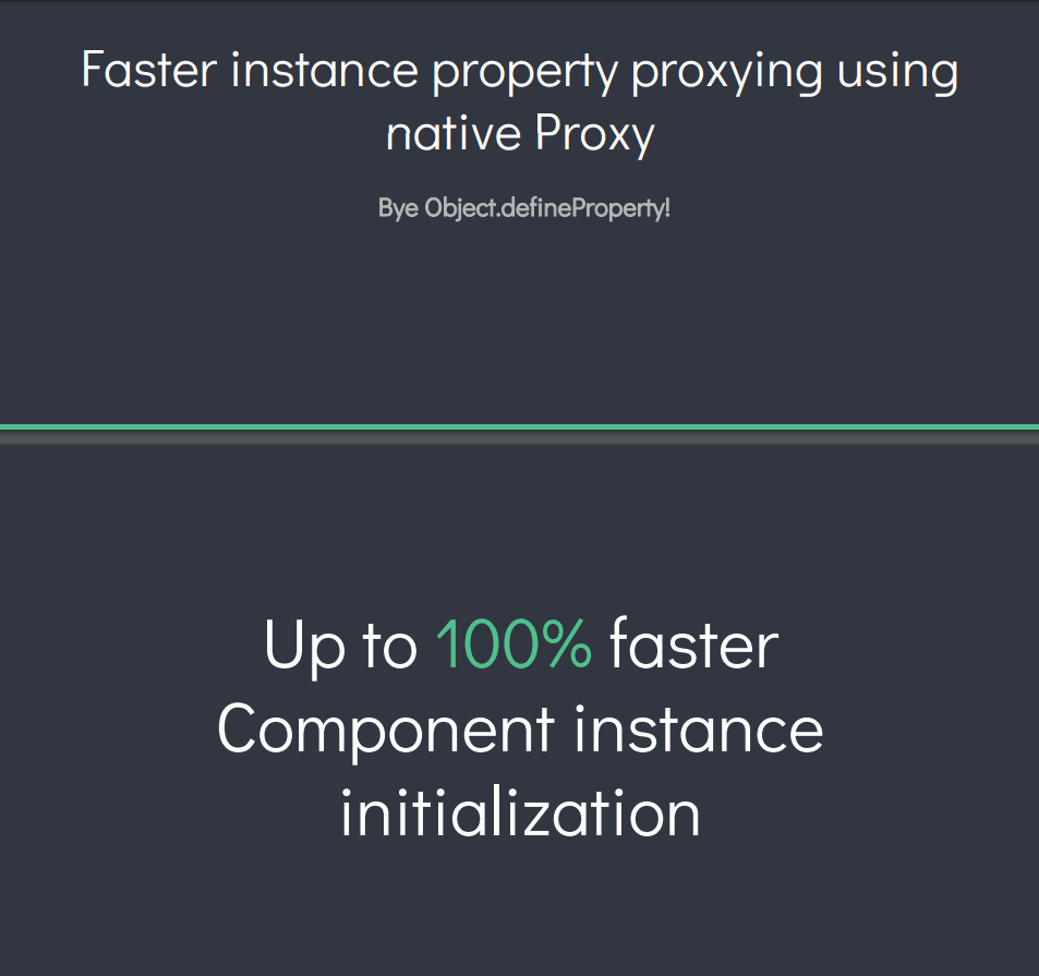 **vue 3.0 已经用的不是这个技术了,采用是 原生的 Proxy,据说速度能够提升100%,截张尤大的ppt,** 2018-11-21 修改本篇笔记