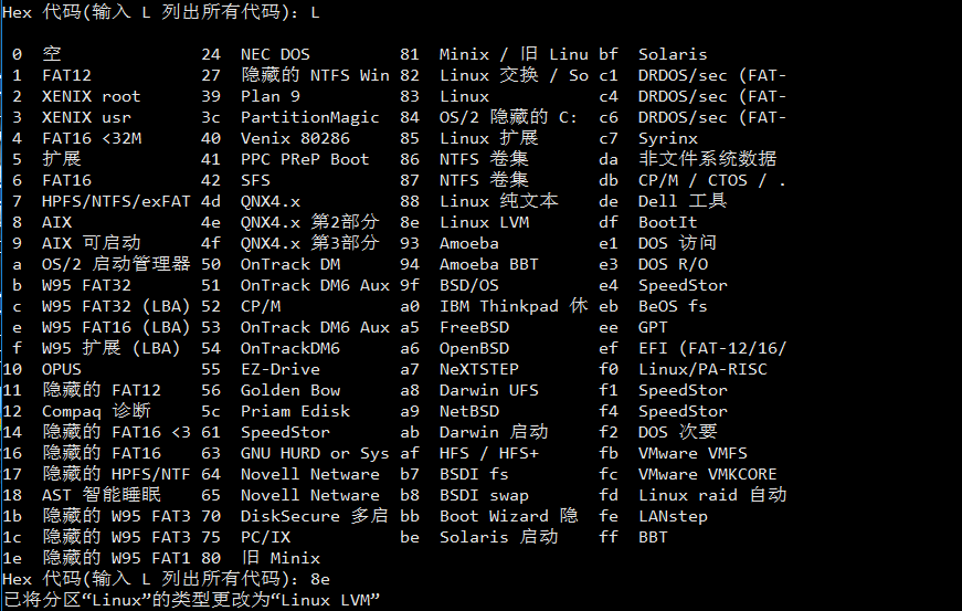 5)输入“L”,回车;接着输入“8e”,回车;(8e:指定分区格式为Linux LVM)