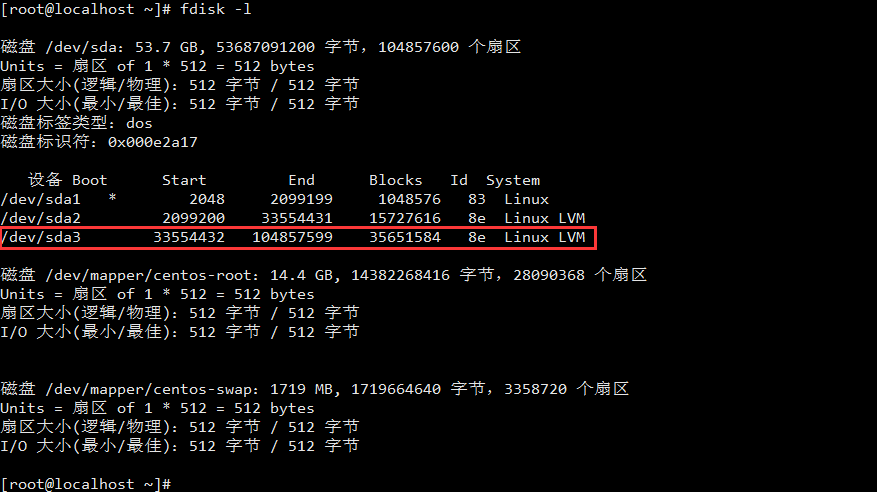 2.4 查看新的分区情况(新的分区/dev/sda3)
