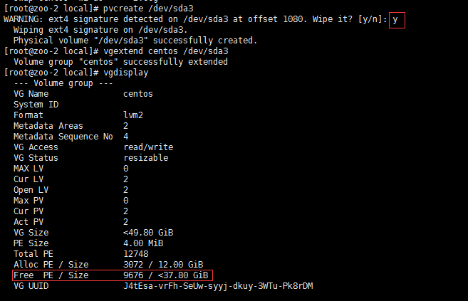 用vgdisplay查看系统当前的VG,主要是查看Free PE/ Size 主要查看Free PE / Size 37.80GiB,说明此系统最多可以有37.80GiB的扩充空间。