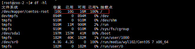 一、首先通过 df -hl 命令查看磁盘占用情况,果然发现根目录已经被占满,这时,我们就需要对其扩容了