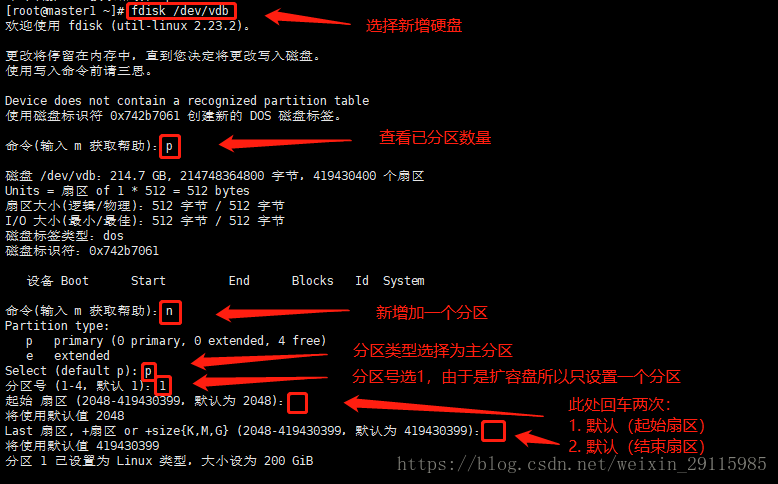 输入分区号1,(如果上面已经有4个分区,可以 d 删除一个分区在创建)