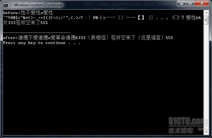 现在来考虑最后的要求中提到的“奇怪情况”,那就需要我们“设身处地”地来思考啦。我们平时想输入敏感字时会用到什么方法呢,无外乎会插入空格或者各种异常标点符号之类,这里会想到用正则表达式岂不正好?符合我们需求的相应函数为std::regex_replace,boost的regex库也有对应函数,这里就用c++ 0x原生的了。