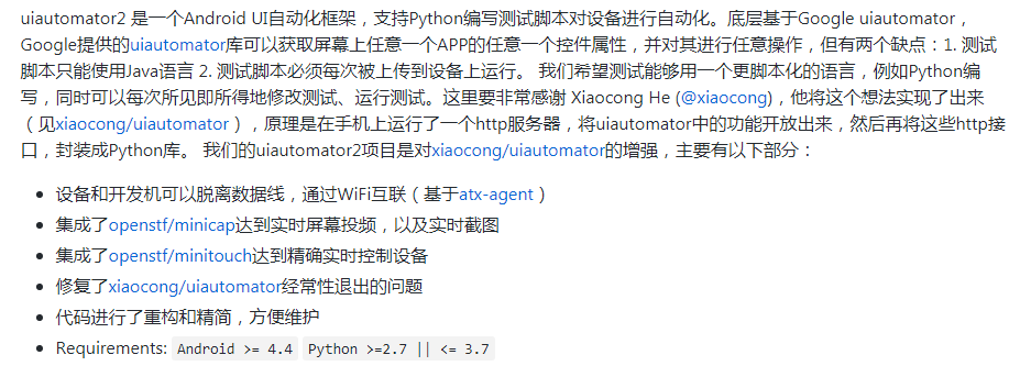 所以在Testerhome这个共享氛围很好,也有不少大牛的论坛上爬文章,发现了openatx这个开源项目,直接截图github的README介绍一下项目情况