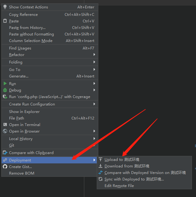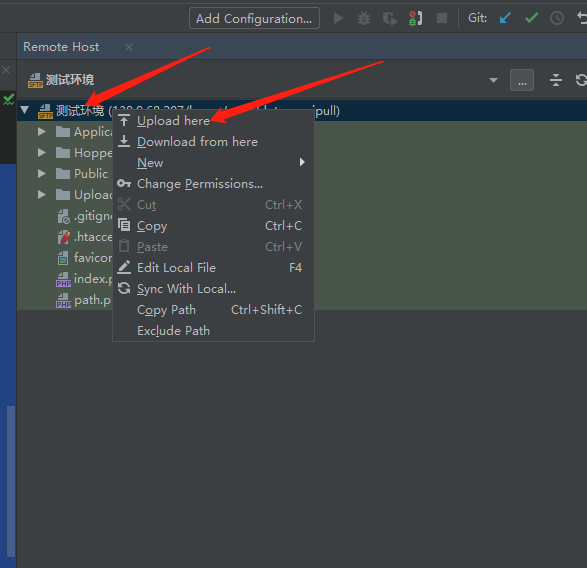 4、通过上面的3步实现了关联本地项目到服务器,修改本地项目后就可以通过右键点击,按照下图操作上传修改的代码或新增的文件到服务器上了