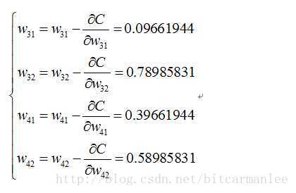 而这个值比原来的0.19要小,则继续迭代,不断修正权值,使得代价函数越来越小,预测值不断逼近0.5.我迭代了100次的结果,Error为5.92944818e-07(已经很小了,说明预测值与真实值非常接近了),最后的权值为: