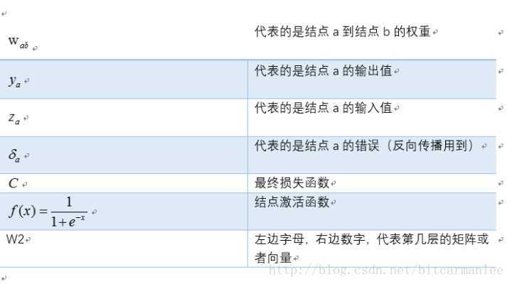 为了方便起见,这里我定义了三层网络,输入层(第0层),隐藏层(第1层),输出层(第二层)。并且每个结点没有偏置(有偏置原理完全一样),激活函数为sigmod函数(不同的激活函数,求导不同),符号说明如下: