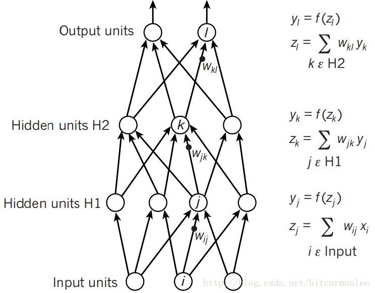 举个例子,假设上一层结点i,j,k,…等一些结点与本层的结点w有连接,那么结点w的值怎么算呢?就是通过上一层的i,j,k等结点以及对应的连接权值进行加权和运算,最终结果再加上一个偏置项(图中为了简单省略了),最后在通过一个非线性函数(即激活函数),如ReLu,sigmoid等函数,最后得到的结果就是本层结点w的输出。