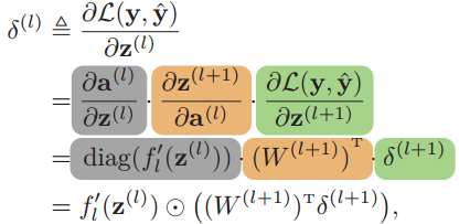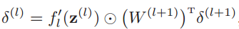 上面这个公式就是误差的反向传播公式!因为第l层的误差项可以通过第l+1层的误差项计算得到。反向传播算法的含义是:第l层的一个神经元的误差项等于该神经元激活函数的梯度,再乘上所有与该神经元相连接的第l+1层的神经元的误差项的权重和。