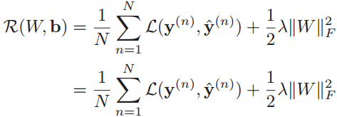 给定训练集D={(x(1), y(1)),(x(2), y(2)),...,(x(N), y(N))},将每个样本x(n)输入给前馈神经网络,得到神经网络的输出后,其在训练集D上的结构化风险函数为: