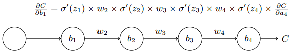 可以通过一个例子来更好的理解这两个问题。来看一个简单的深度神经网络:每一层都只有一个神经元。如下图是有三层隐含层的神经网络: