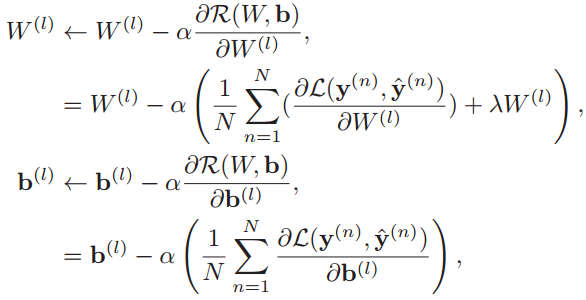 然后用梯度下降法来进行学习。在梯度下降法的每次迭代中,第l层的参数W(l)和b(l)的参数更新方式为:
