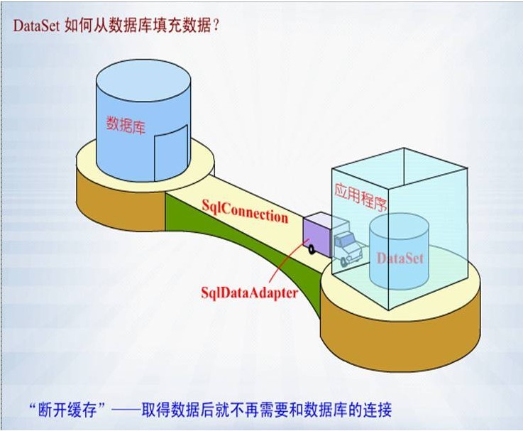 第(3)种方式的工作过程就是,架设好桥后,二愣子拿着“订单”开着车往工厂跑,但这次订单要求的货物比较多,工厂就把这一堆货物帮二愣子装上车,二愣子高高兴兴的开着车兜着风把这一堆货物运回去。这次二愣子不仅能兜风,而且也只跑一趟(这份工作真拉风!)。车开回来后就可以断开连接了(完全可以把桥拆了),因为需要的所有货物都已经通过货车运回来了。此时,货车就比喻为DataAdapter对象,DataSet对象就比喻成货车拉回来的那“一堆货物的集合”。