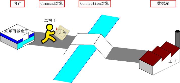 图中把工厂比喻成数据库,把商城仓库比喻成应用程序所在内存,把Command比喻成取货员“二愣子”(因为他比较笨),把Sql语句比喻成订单,把桥比喻成数据库连接对象。