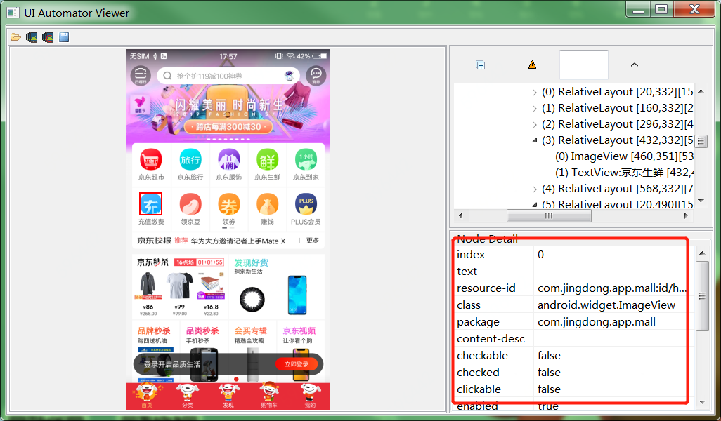 可以打开手机上的app了,下一步元素定位uiautomatorviewer,通过定位到页面上的元素,然后进行相应的点击操作。