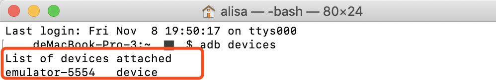 mac打开终端(windows打开命令行工具)->输入指令“adb devices”->显示设备号即连接成功