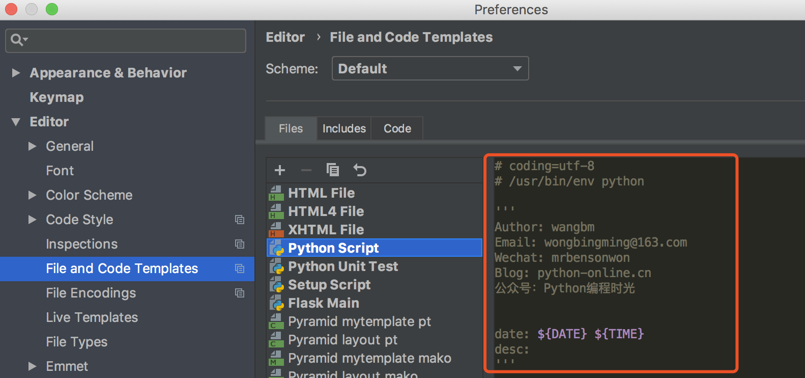 Pycharm 提供的这个代码模板,可以说是相当实用的一个功能了。它可以在你新建一个文件时,按照你预设的模板给你生成一段内容,比如解释器路径,编码方法,作者详细信息等