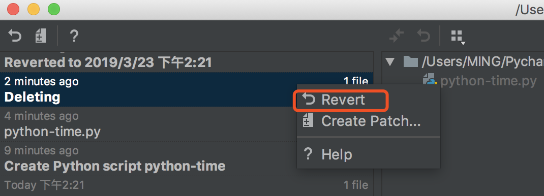 我想这可能是一次非同寻常的 delete,会不会是在 Pycharm 里的 发起删除操作,不会往回收站里丢呢?经过一番测试,在回收站还真的找不着,但是这次尝试也无意中发现了 Pycharm 的隐藏的一个功能 Local History,它会保存你对文件的所有操作记录。