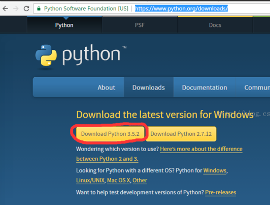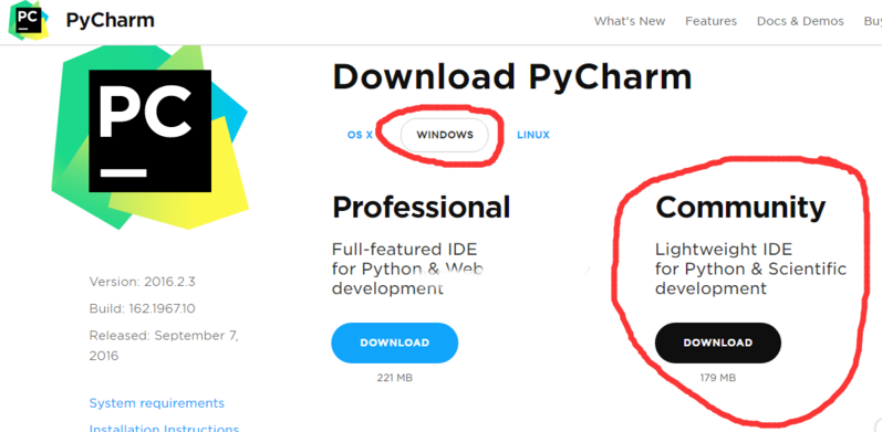 首先从网站下载pycharm:点击打开链接(链接为:http://www.jetbrains.com/pycharm/download/#section=windows),进入之后如下图,根据自己电脑的操作系统进行选择,对于windows系统选择图中红色圈中的区域。