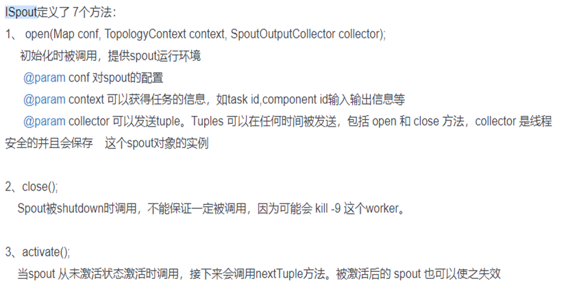 ISpout是实现Spout的核心接口, Spout负责将数据送到topology中处理, Storm 会跟踪Spout发出的tuple的DAG: