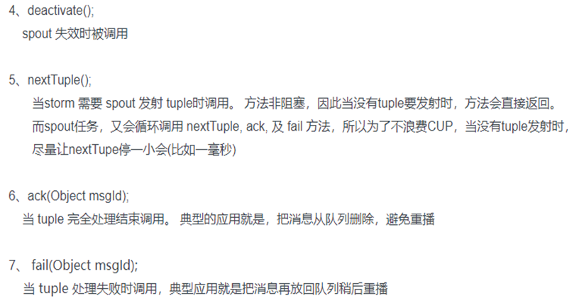 2.Storm在相同的线程中执行ack , fail , nextTuple,这意味着ISpout的实现者不用考虑这些方法的并发性问题, 但是,同时要保证nextTuple方法不能阻塞,否侧导致ack, fail被阻塞,等待执行,然而fail的timeout决定不能被阻塞。