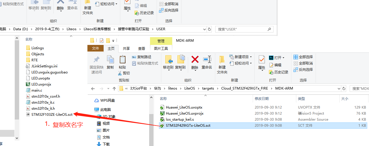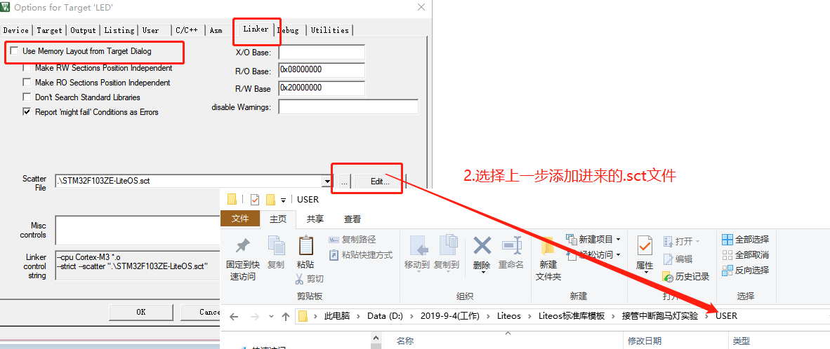 在 LiteOS 中,中断向量表被放在运行内存里,避免影响分配内存,那么就需要将代码分散加载到不同的区域中,华为官方提供的分散加载文件就在每个具体的工程文件目录下,如 : LiteOS \targets\ STM32F429IGTx_FIRE\MDK-ARM 文 件 夹 下 的 STM32F429IGTx-LiteOS.sct 文件。首先将它拷贝到我们自己的工程中去,并且将其名字修改为“Fire-F103-LiteOS.sct”,放在工程的 user 文件夹中,然后在工程中把 “Fire-F103-LiteOS.sct”文件到工程配置中