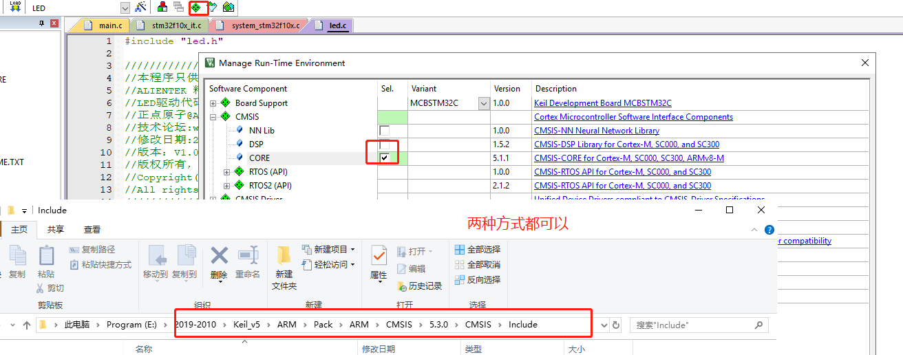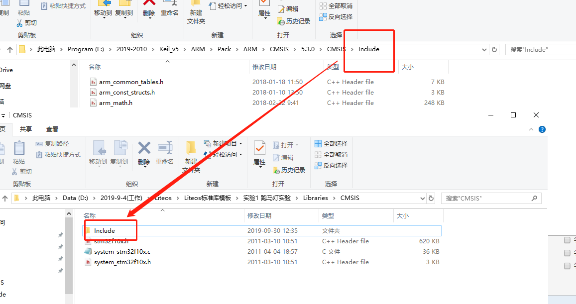 添加 CMSIS的库,可以打开工程在mdk里面添加,也可以新建\Libraries\CMSIS\include,include文件夹从 keil 安装目录下C:\Keil_v5\ARM\Pack\ARM\CMSIS\5.3.0\CMSIS\Include,将其包含进来可以避免其它电脑 在移植过程中没有相关头文件而引起的编译错误