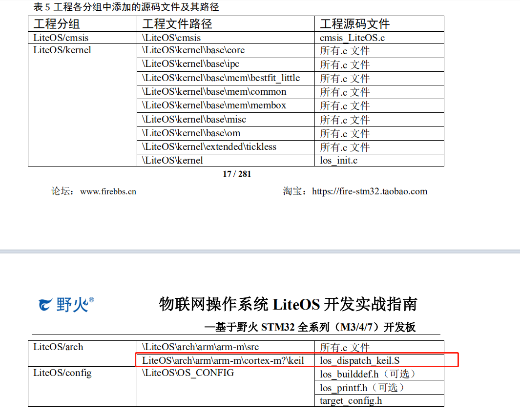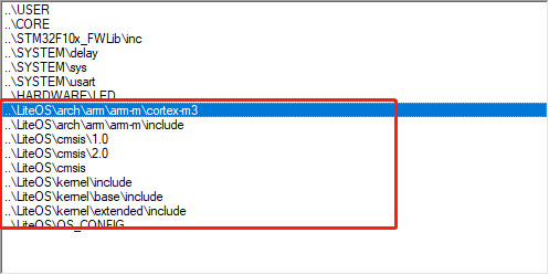 需 要 在 开 发 环 境 里 面 新 建 LiteOS/cmsis 、 LiteOS/kernel 、 LiteOS/arch 和LiteOS/config 四个文件分组,其中 LiteOS/cmsis 用于存放 LiteOS 文件夹下 cmsis 文件夹的内容,LiteOS/kernel 用于存放 LiteOS 文件夹下 kernel 文件夹的内容,LiteOS/arch 用于存放LiteOS 文件夹下 arch 文件夹的内容。而 LiteOS/config 用于存放 LiteOS 文件夹下的OS_CONFIG 文件夹的内容。