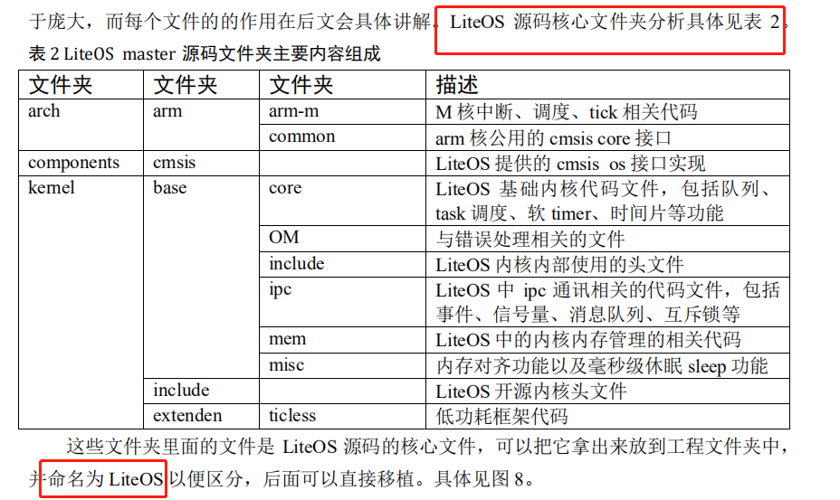 打开 LiteOS 源码文件,可以看见里面有 8 个文件夹,下面先来了解一下主要的文件夹及其子文件夹的作用,然后将 LiteOS 源码的核心文件提取出来,添加到工程根目录下的文件夹中,因为工程只需要有用的源码文件,而不是整个 LiteOS 源码,