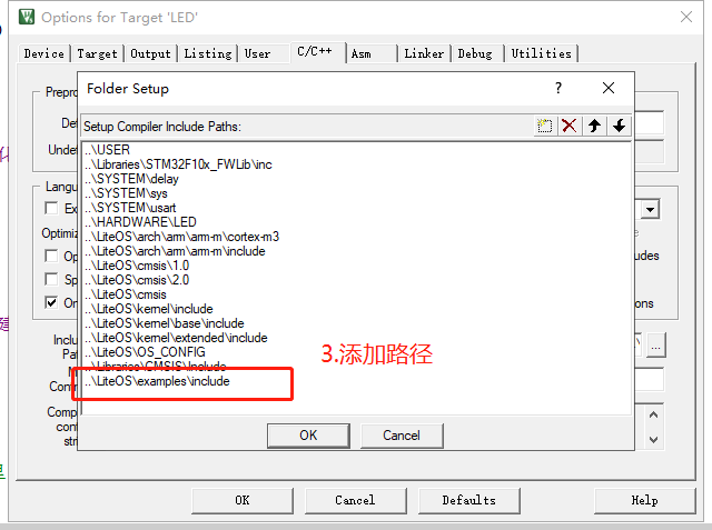 在 LiteOS 中,需要 C99 标准的支持,并且忽略相关的警告,选择“target”→ “C/C++”,在“Misc Controls”选项中输入--diag_suppress=1,47,177,186,223,1295,意思是忽略这些编号的警号,