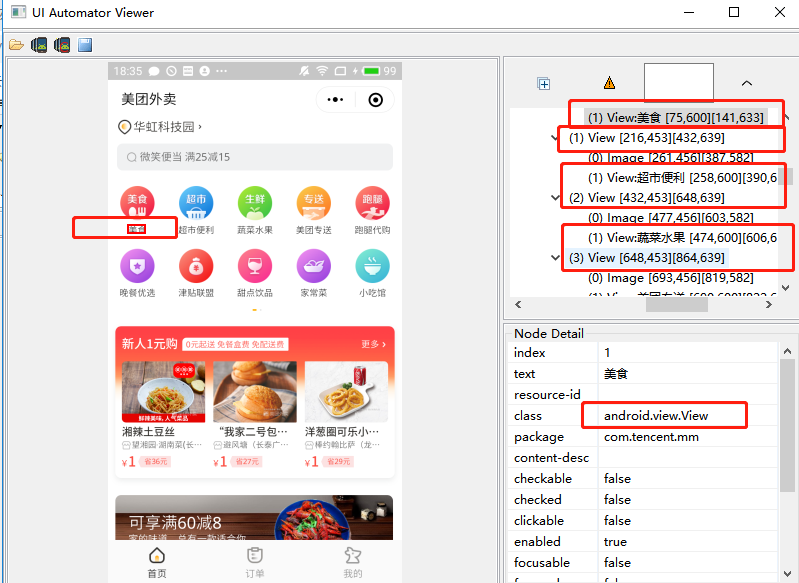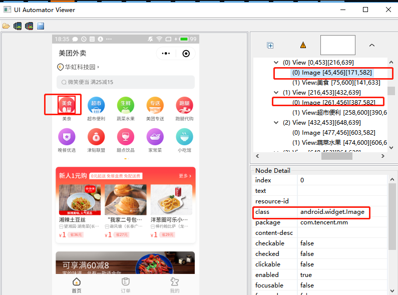 在UI Automator上,点击页面元素,可以发现,小程序页所有文本元素属性class都是android.view.View,图片的class属性都是android.widget.Image,且无id等常用属性值,仅可以通过text,坐标来定位元素唯一性。