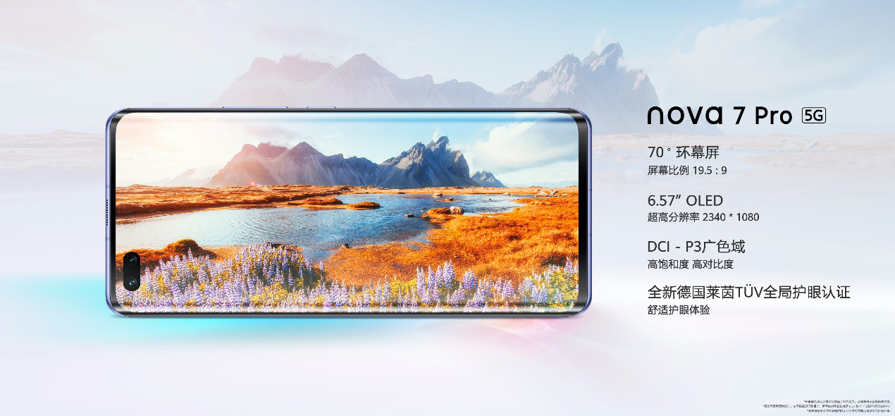 屏幕方面,nova7全系OLED屏幕,通过全新德国莱茵TÜV全局护眼认证,视觉效果更佳。nova7 Pro采用6.57英寸19.5:9 FHD+曲面屏,70°曲率,视觉观感更高级,视野更开阔,前后双曲面机身设计,握持体验更舒适。