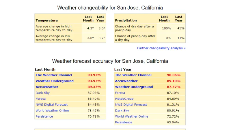 根据ForcastWatch4月份报道,去年一年DarkSky在美国加利福尼亚州圣荷西的预报准确率达到了80.91%,今年三月份达到87.93%。
