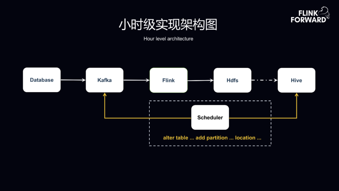 如下图所示,Database 中的 Binlog 导出到 Kafka,同时 Log Server 数据也会上报到 Kafka。所有数据实时落地到 Kafka 之后,通过 Flink 抽取到 HDFS。下图中 HDFS 到 Hive 之间为虚线,即 Flink 并非直接落地到 Hive,Flink 落地到 HDFS 后,再落地到 Hive 的时间可能是小时级、半小时级甚至分钟级,需要知道数据的 Event time 已经到何时,再触发 alter table,add partition,add location 等,写入其分区。