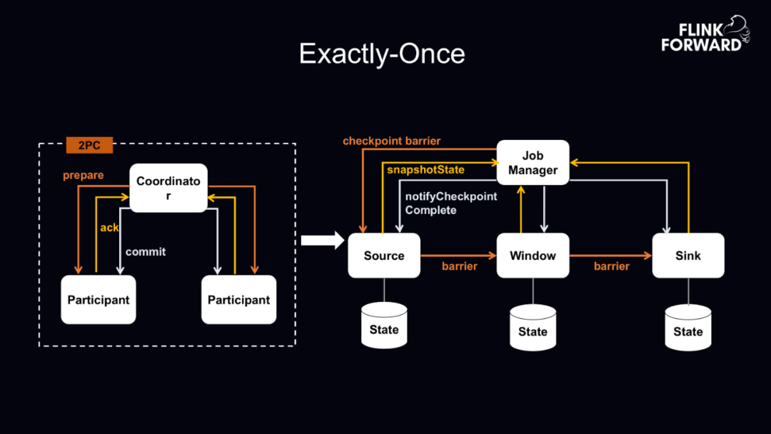 下图左侧为一个简单的二 PC 模型。Coordinator 发送一个 prepare,执行者开始触发 ack 动作,Coordinator 收到 ack 所有消息后,所有 ack 开始触发 commit,所有执行者进行落地,将其转化到 Flink 的模型中,Source 收到 checkpoint barrier 流时,开始触发一个 snapshot。