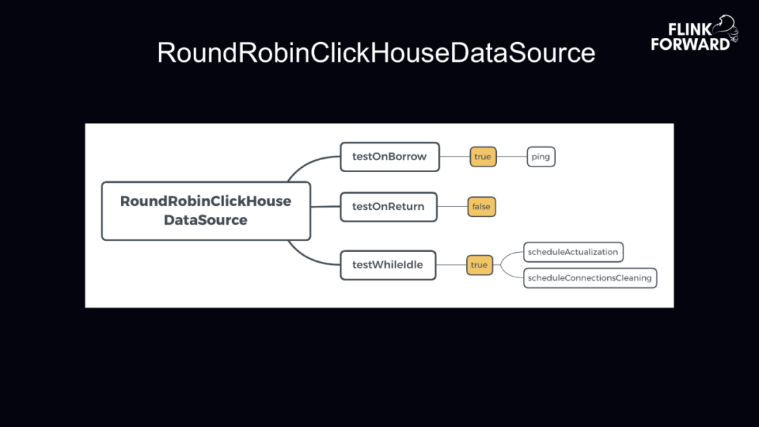 RoundRobinClickHouseDataSource:趣头条对BalancedClickHouseDataSource 进行加强的结果,实现了三个语义。testOnBorrow 设置为 true,尝试 ping 看能否获取连接。用 ClickHouse 写入时是一个 batch,再将 testOnReturn 设置为 false,testWhileIdel 设置为true,填入官方 scheduleActualization 和 scheduleConnectionsCleaning 的功能。ClickHouse 后台不断进行 merge,如果 insert 过快使后台 merge 速度变慢,跟不上 insert,出现报错。因此需要尽量不断往下写,等写完当前机器,再写下一个机器,以5s间隔进行写入,使 merge 速度能够尽量与 insert 速度保持一致。