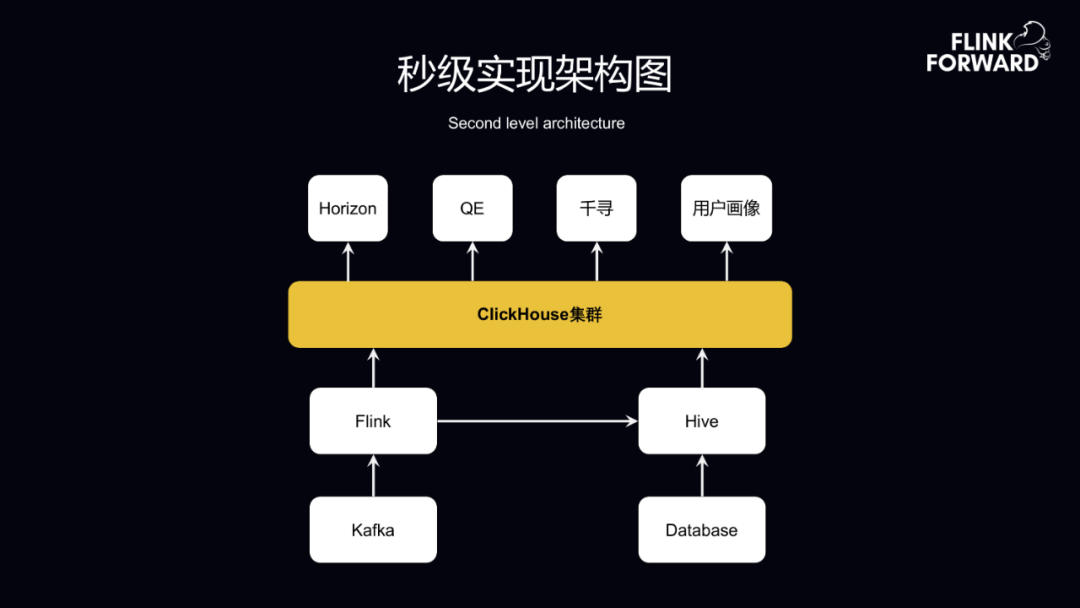 因此会出现 Flink 任务不断修改或者不断起新的 Flink 任务的问题。趣头条尝试在 Flink 后接入 ClickHouse,实现整体的 OLAP。下图为秒级实现架构图。从 Kafka 到 Flink,到 Hive,到 ClickHouse 集群,对接外部 Horizon(实时报表),QE(实时 adhoc 查询),千寻(数据分析),用户画像(实时圈人)。