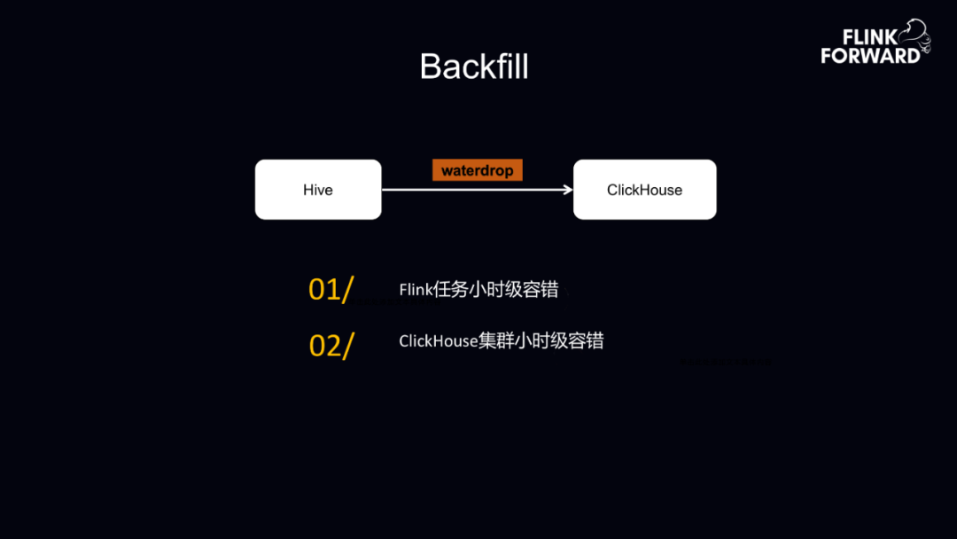 由于之前已经通过 Kafka 将数据实时落地到 Hive,通过 Hive 将数据写入 ClickHouse 中。ClickHouse 有分区,只需要将上一个小时的数据删除,导入 Hive 的一小时数据,就可以继续进行数据查询操作。Backfill 提供了 Flink 任务小时级容错以及 ClickHouse 集群小时级容错机制。