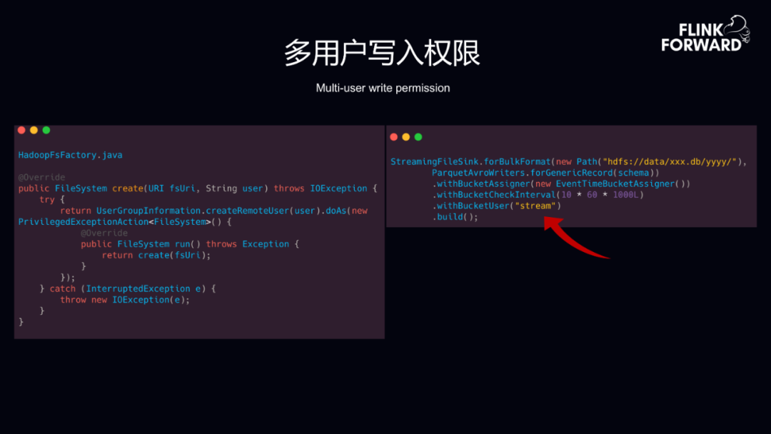 实时要写入离线 HDFS,可能会涉及用户权限问题。实时提交的用户已经定义好该用户在所有程序中都是同一个用户,但离线中是多用户的,因此会造成实时和离线用户不对等。趣头条在 API 中添加了 withBucketUser 写 HDFS。配置好 nameservices后,接下来只需要知道该 HDFS 路径通过哪个用户来写,比如配置一个 stream 用户写入。